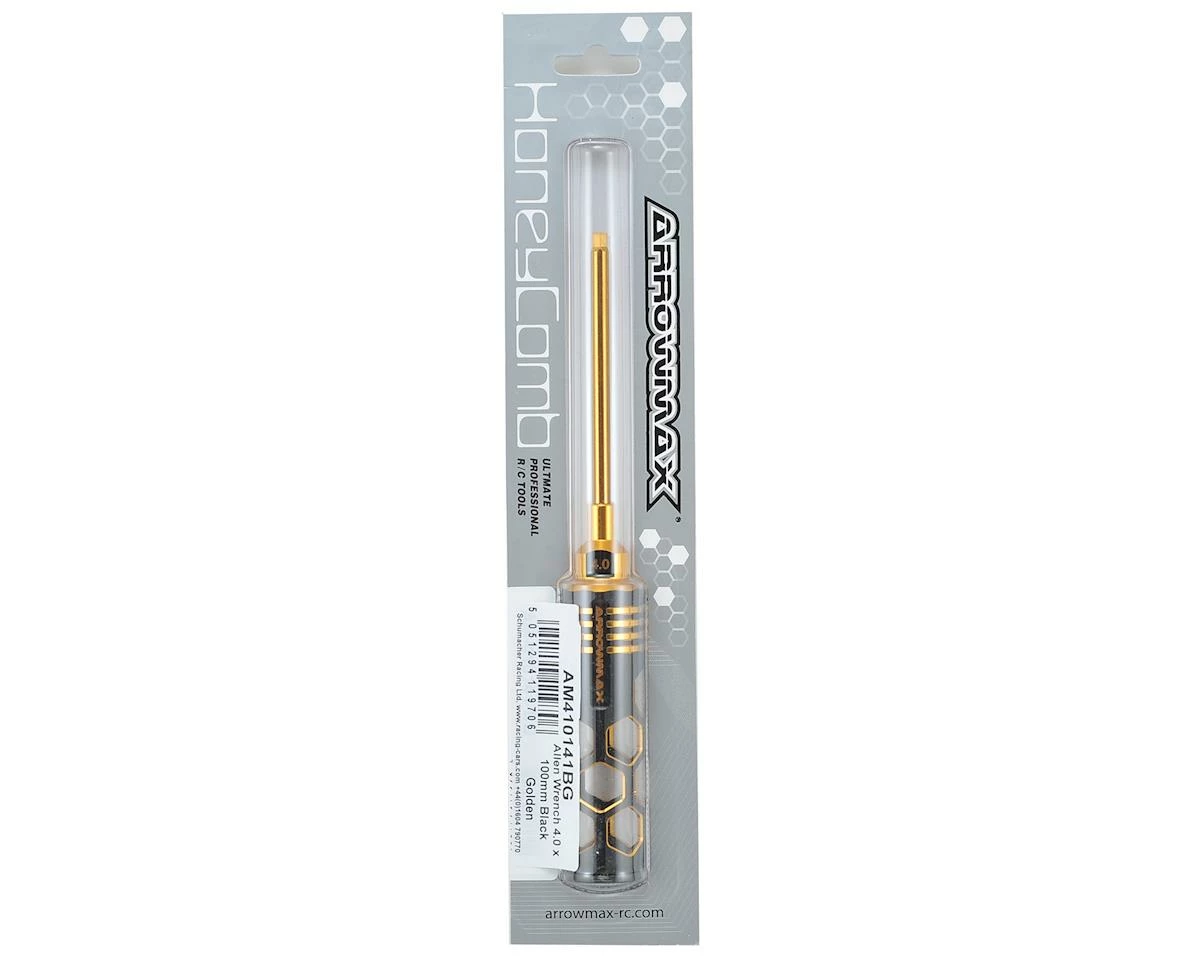 This is the Arrowmax Limited Edition Metric 4mm Allen Wrench. This tool features an eye-catching hollow honeycomb handle design with a rich black and gold color finish. Spring steel titanium nitride tips and a bottom cover provide a more comfortable, controllable and lighter feeling.