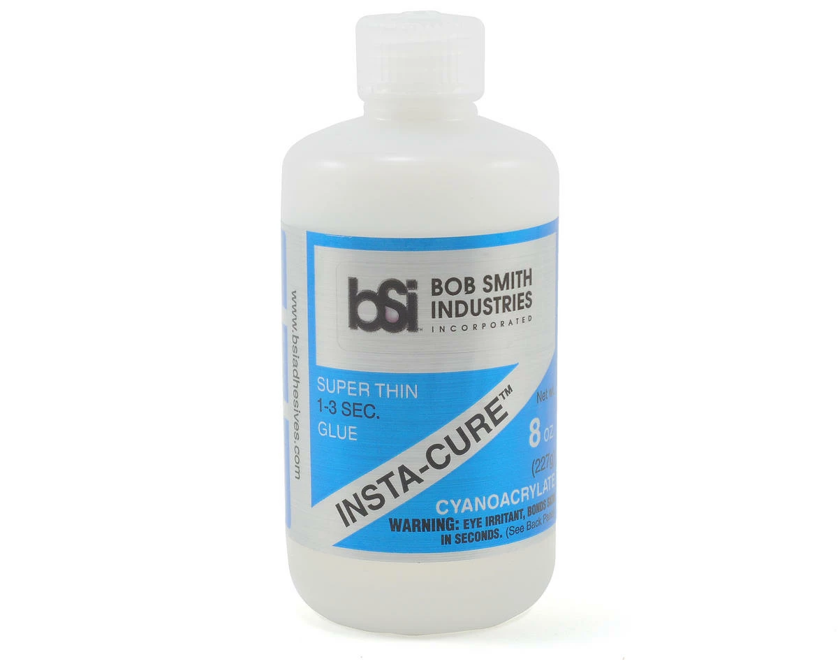 This is a eight ounce refill bottle of Bob Smith Industries Super Thin INSTA-CURE™ CA Glue. INSTA-CURE™ has a water-thin viscosity that wicks deep into joints by capillary action and cures in a matter of a few seconds. Surfaces to be bonded must be tight fitting and should be held together while you apply the CA around the edges of the seam. At the moment CAs cure, they give off a vapor that can irritate the nose and eyes, so be prepared. Thin CAs work very well on balsa since they penetrate into the wood and form more than just a surface bond.