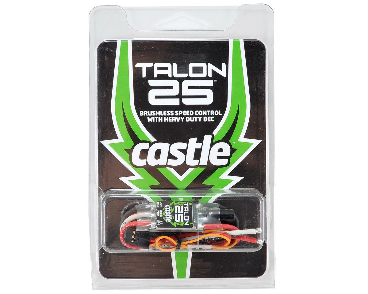 This is the Castle Creations Talon 25 Brushless ESC. This compact controller can keep it’s cool even during the most extreme 3D maneuvers. Talon 25 is intended for use in most 400-size helicopter setups running up to 6S LiPo or your favorite 3D foamie that pulls up to 25 amps. Despite it’s size, it boasts an impressive 8 amp peak/3 amp continuous BEC, keeping even the most draining servos at ease. Talon 25 also offers Castle’s industry-leading helicopter functions, not to mention easy programming using the Castle Link USB adapter (coupon for free Castle Link included). Talon 25 tips the scales at a mere 18 grams!