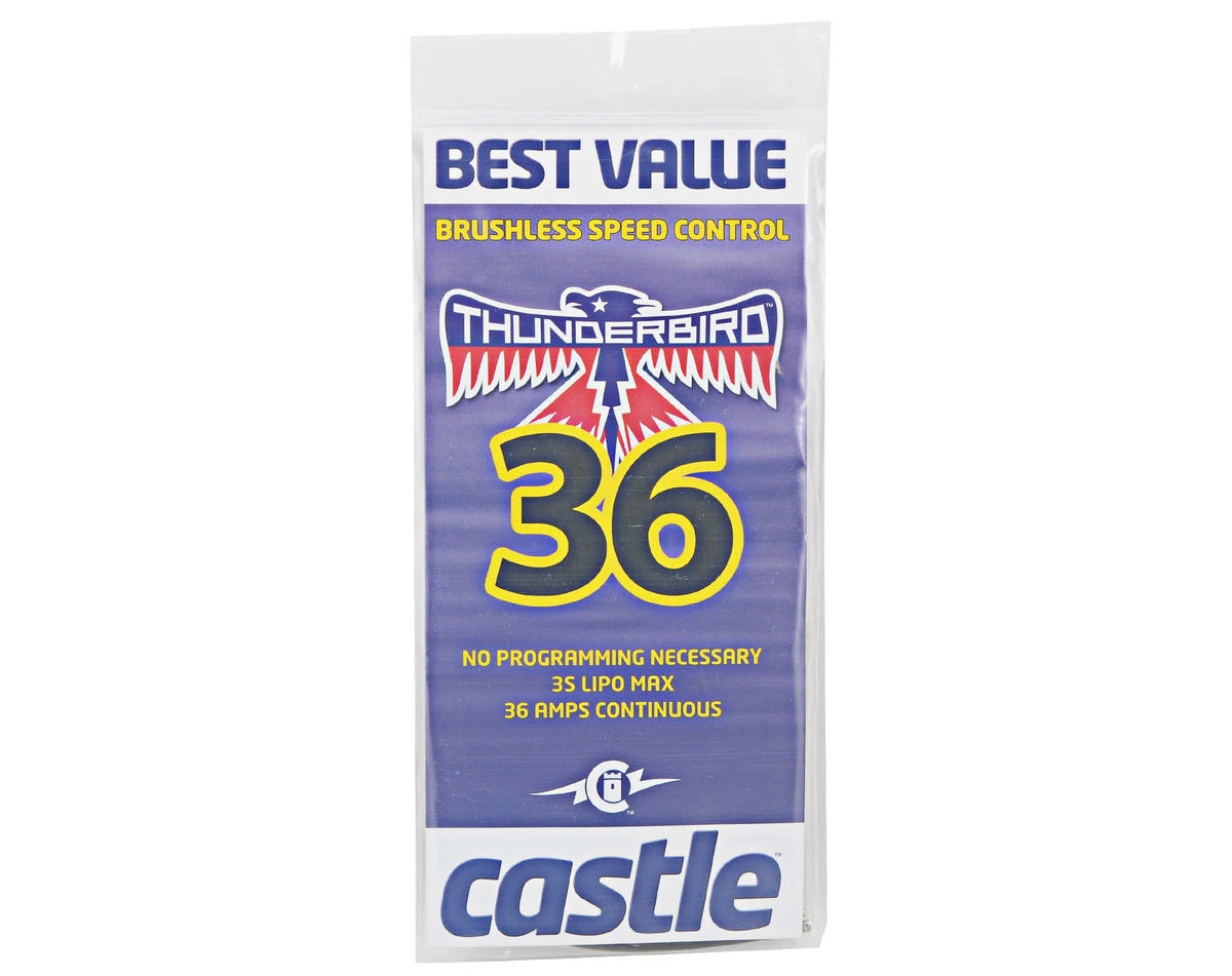 This is the Castle Creations Thunderbird 36-Amp Brushless ESC. All Thunderbird controllers are ready to fly straight from the package, no programming necessary. They are defaulted to AUTO LIPO detect and no brake. Should users wish to modify these settings, they may do so using their transmitter or with Castle’s incredible Castle Link USB Programming Kit (sold separately).