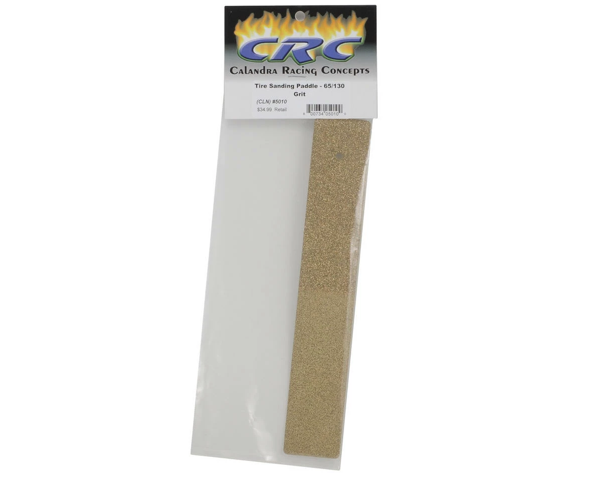This is a 60/120 Grit Tire Sanding Paddle from Calandra Racing Concepts. Finally, no more having to use the wife’s nail files or a machinists metal file! The new CRC Tire Paddle gets the job done right, and with ease. The tire paddle has a coarse 65 grit on one end to round the edges on even the toughest rubber, such as purple front tires. Then flip it around and get the perfect finish with the 130 grit end. With this Sanding Paddle from CRC, tire truing has never been easier!
