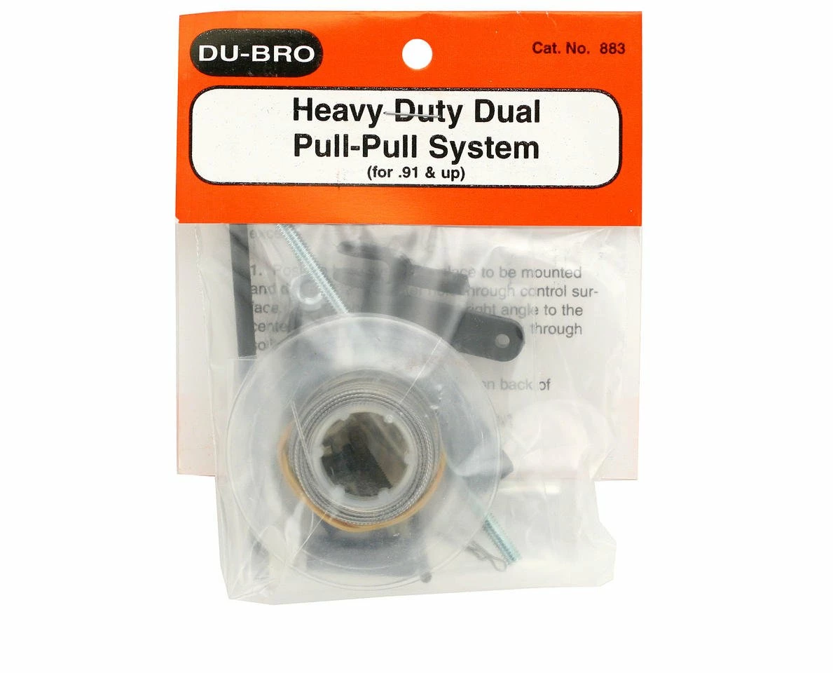 This is the Du-Bro RC Heavy Duty Dual Pull-Pull System for large aircraft .91 and larger. This pull-pull system comes complete with high quality aluminum horns, washers, steel 8-32 long shaft, nuts, horn arms, and cleveses (for 4-40 rods) with aluminum pivot pins plus 15ft. of nylon coated stranded steel cable (.032 dia.) and all mounting hardware for 4-40.