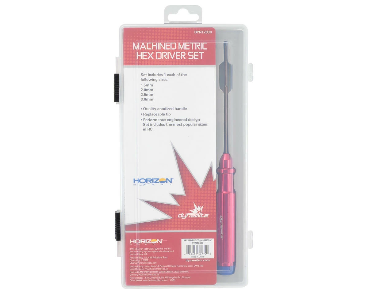 This is the Dynamite Machined Metric Hex Driver Set. Dynamite tools feature stylish red anodized aluminum handles, with replaceable steel tips. To make wrenching easier on your hands, the handles include rotating plastic end caps to swivel in your palm. Plus, the end caps have the tool size printed on the end, and are color coded for easy identification. Package includes 1.5mm, 2.0mm, 2.5mm and 3.0mm size hex wrenches.