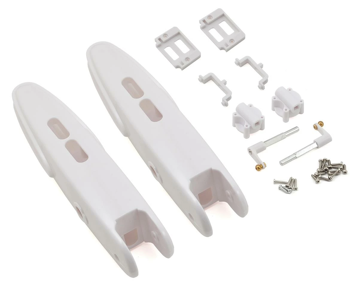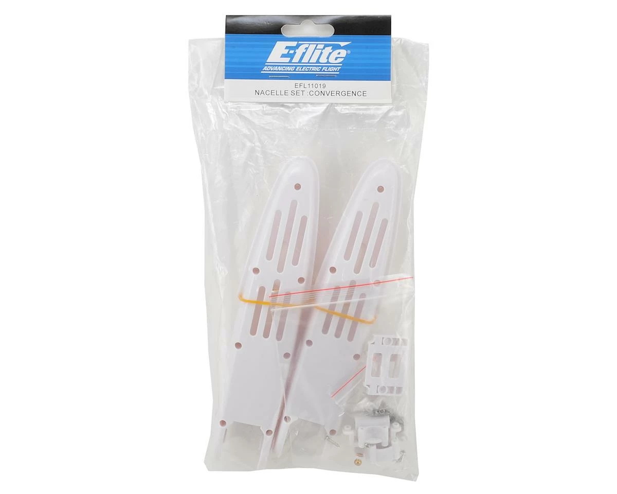E-flite Convergence VTOL Nacelle Set. Package includes two nacelle housings, two servo mounts, two main motor mounts, motor mount pivot arms and hardware.