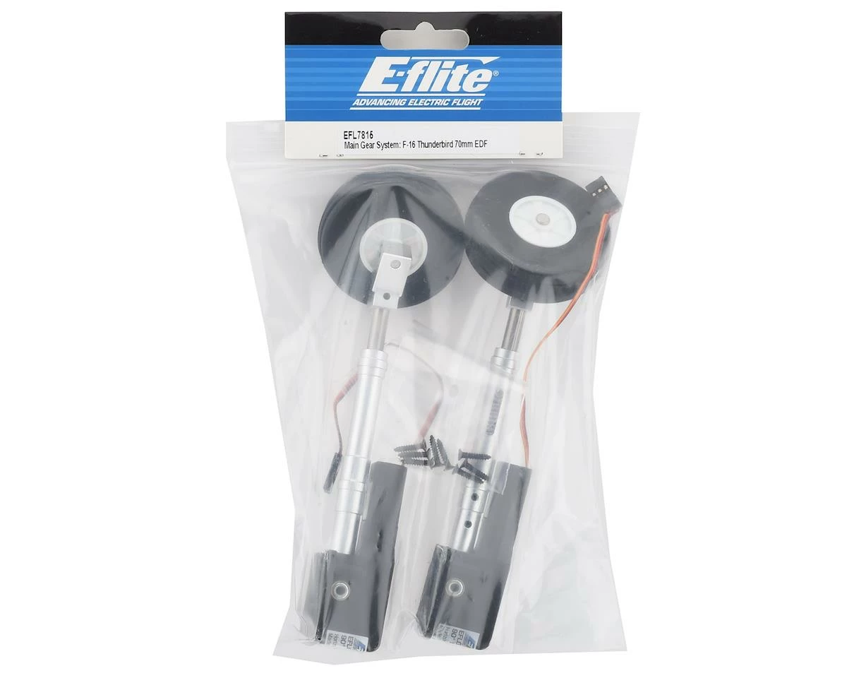 This is a replacement E-flite Main Gear System for the F-16 Thunderbird Electric Ducted Fan Jet Airplane. These items come assembled and ready for installation.