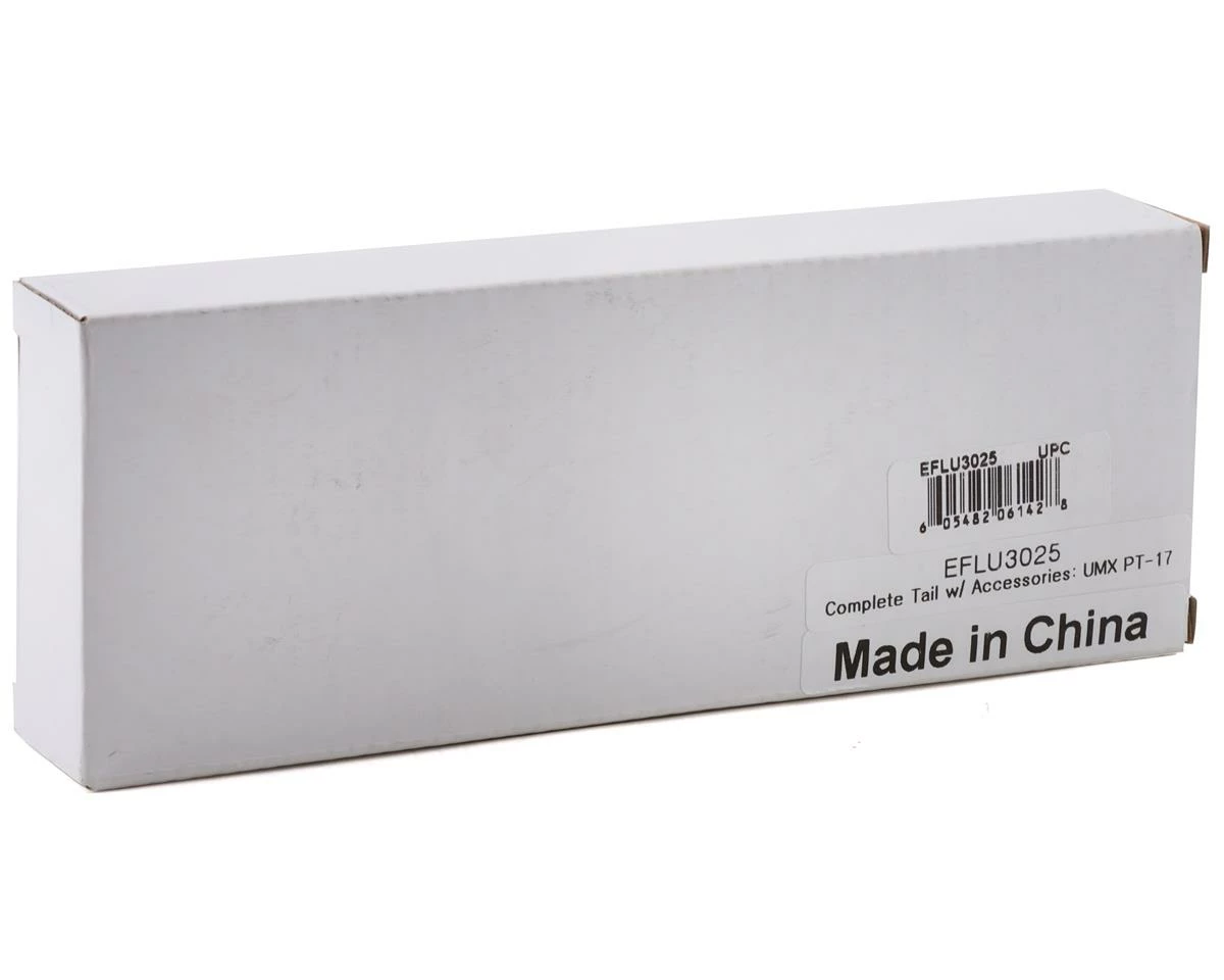 This is a replacement E-flite UMX PT-17 Complete Tail Set. Package includes vertical and horizontal stabilizers, tail wheel, trim tabs and hardware.