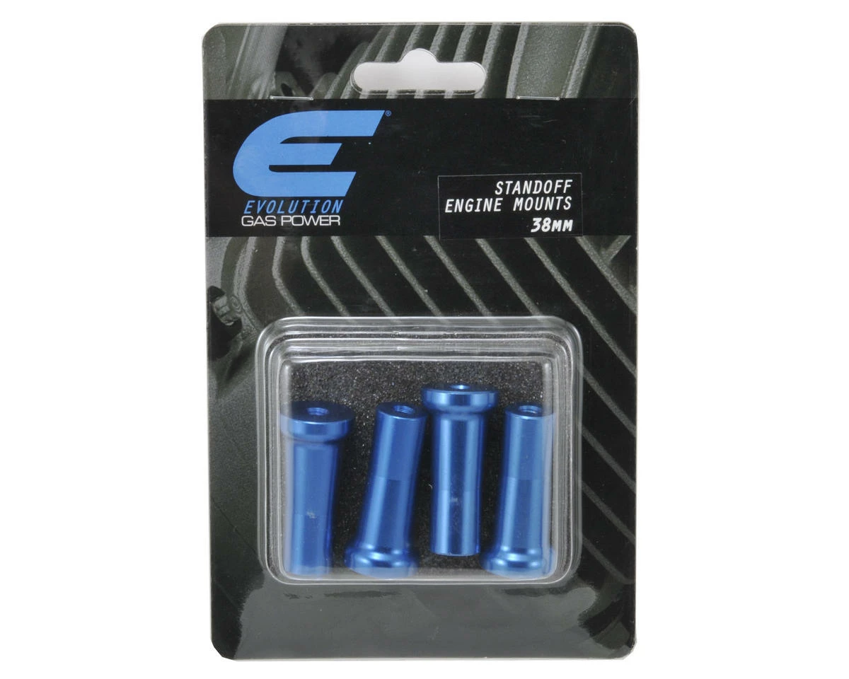 This is a pack of four Evolution 38mm Standoffs, and are intended for use as gas engine mounts. These blue anodized mounts allow for a more precise engine mounting process.