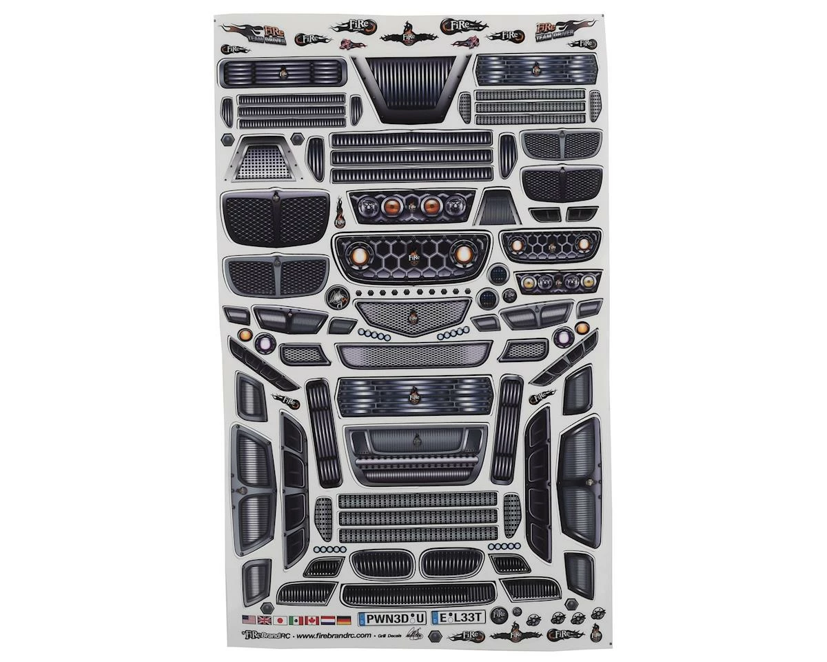 The Firebrand Grilles Multi-Fit Decal Sheet is designed to give your body a unique, “next-level” look. Exclusive, FireBrand RC Multi-fit decal sheets are designed to fit any 1:10 scale (or similar) remote-controlled car, truck, plane, helicopter or boat body.
