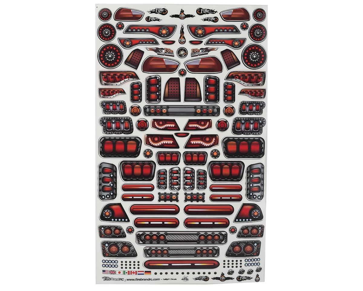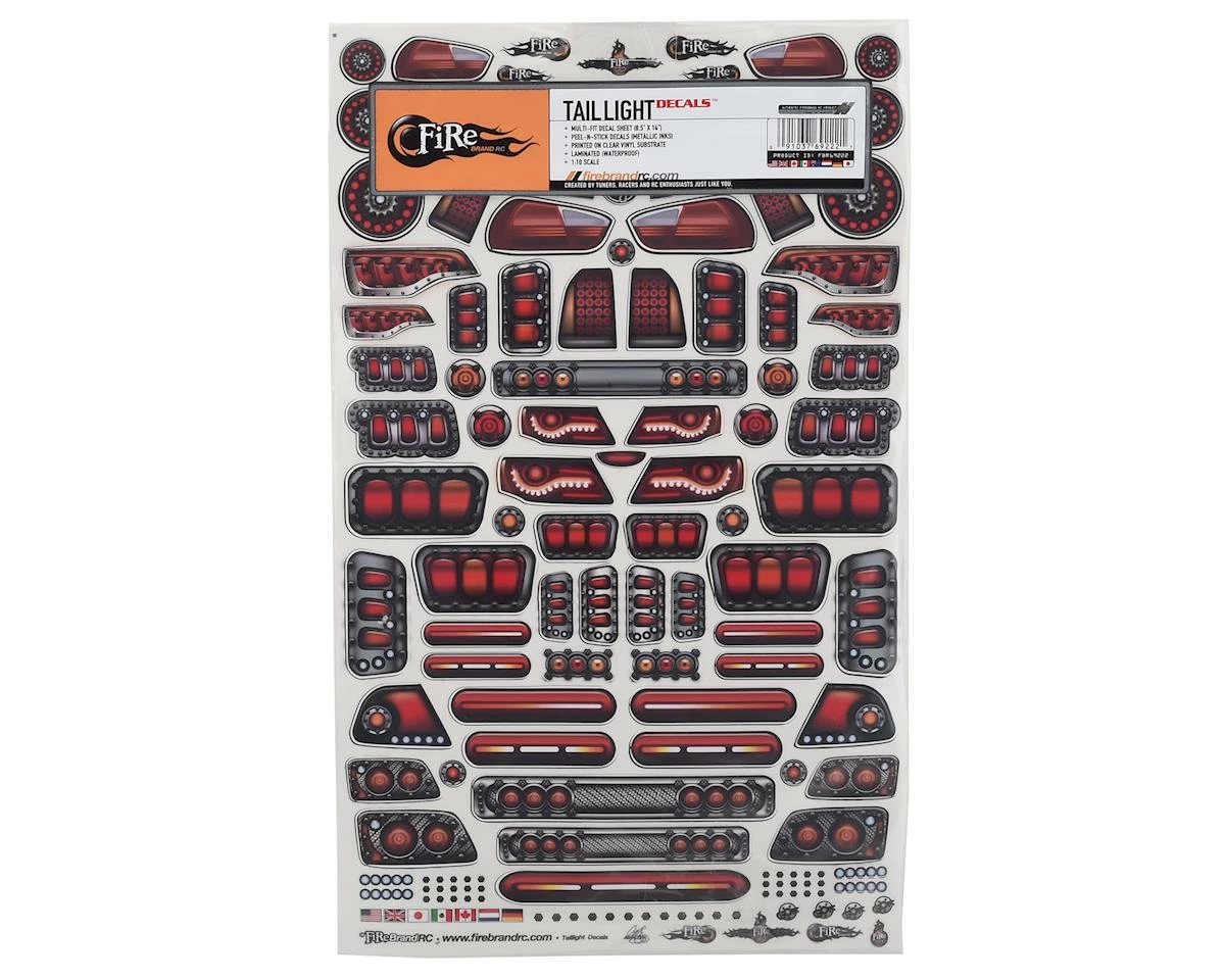 FireBrand Tail Lights Multi-Fit Decal Sheet. These decals are specifically designed to enhance the overall look of any RC vehicle. These vinyl decal sheets employ the latest in digital printing techniques and are designed to give your body a truly unique look that will resist the elements and stand the test of time. With such a wide variety of different decals per sheet, they can be used on a variety of different vehicles. FireBrand RC decals perform great on RC cars, trucks, planes, boats and helicopters. These versatile and inter-changeable decals are a “must have” for every RC enthusiast. Designed to fit most 1:10 scale, remote-controlled vehicles.
