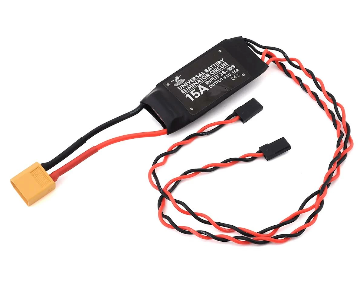 This is the Flite Test 15 Amp Universal Battery Eliminator Circuit (UBEC). Rated for use with 3S up to 10S LiPo batteries the UBEC uses power from the battery you use to power your motor to provide 5.5VDC to operate your receiver, servos and FPV equipment.