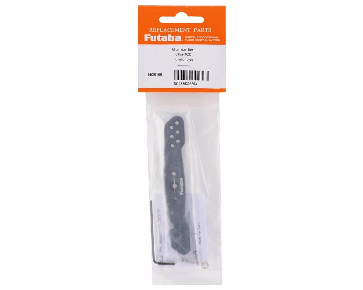 Futaba 89mm Aluminum Clamping Servo Horn. This optional servo horn is intended for servos equipped with a 25T servo spline. Package includes one servo horn, one clamp screw and one allen key.