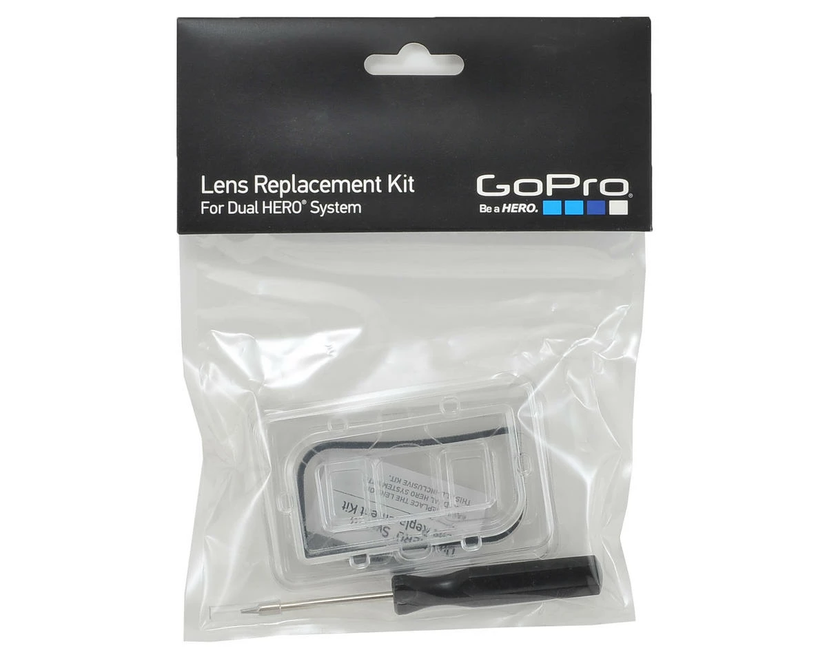 This is the GoPro Dual HERO Lens Replacement Kit. This kit contains everything you need to replace the glass lens on your Dual HERO System housing. Includes a replacement lens and seal, screws and a screwdriver for hassle-free repairs.