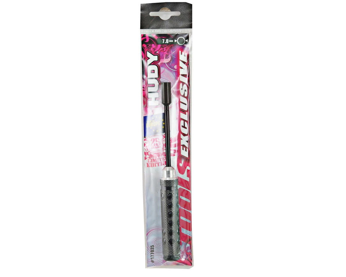 This is the Hudy Limited Edition 7mm Socket Driver. Featuring a super-lightweight CNC-machined Swiss 7075 T6 aluminum handle with a diamond pattern surface for unsurpassed grip. The handle includes a black plastic cap press fit into the handle end. Optional color-coded plastic caps (violet, red, blue) are available to customize the tools to your specifications.