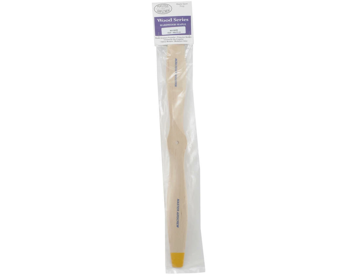 This is a Master Airscrew Maple 18″x6° Propeller. Master Airscrew propellers are made from lightweight, kiln-dried maple wood. Using the latest in engineering technology, these props are betterbalanced and make less noise compared to previous models and featuresquare tips with ample airfoil sections for sport and electric flying.