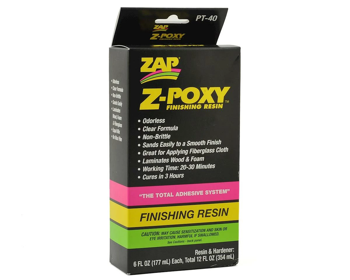This is a 12 oz set of Z-Poxy Finishing Resin Epoxy from Pacer Technologies. Clear, equal-mix. Cures in 3 hours. Used for fiber-glassing center section of airplane wings, entire airplanes, boat hulls, and other fiberglass applications.