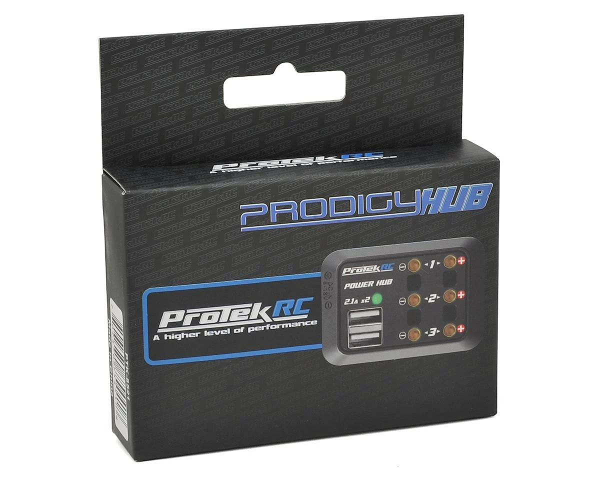 The ProTek RC Prodigy DC Power Hub features three DC output ports that support both banana connector and alligator clip. Two 5V/2.1A USB ports support smart phone and other devices and the DC input power lead can be easily changed to suit your application.