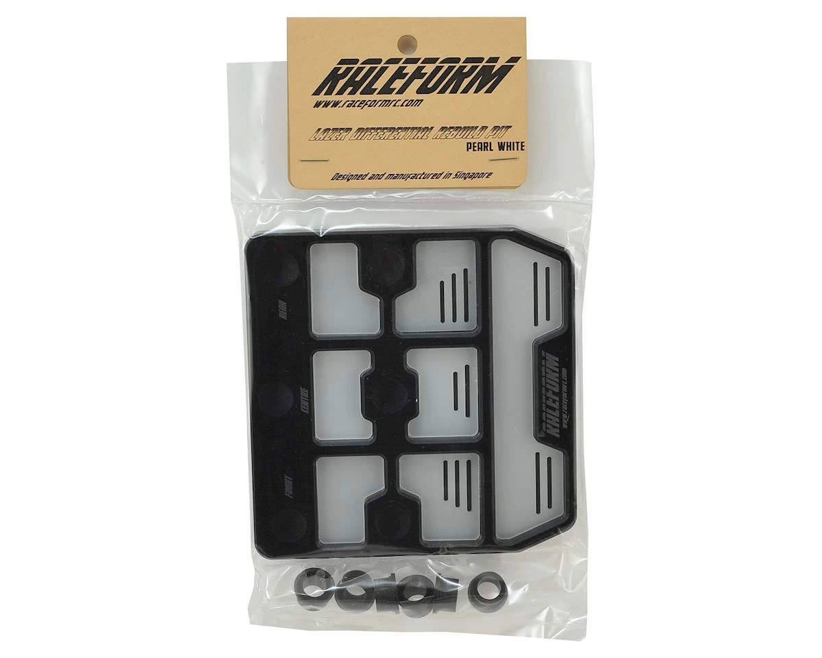 The Raceform Lazer Differential Rebuild Pit is designed to make 1/10 and 1/8 scale diff maintenance easier. The design allows compatibility with all cars, and the compartments inside the tray have milled slots to hold shims and o-rings, making them easier to grab from the tray.