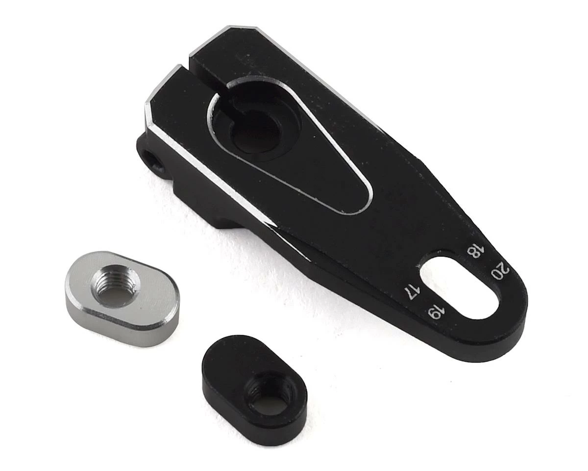The Samix Aluminum Adjustable Servo Horn allows you to adjust the servo link mounting point on the servo horn in four increments – 17, 18, 19, and 20mm. This adjustment allows you to alter the feel and power of the steering. When mounted closer to the spline, it will create more mechanical torque. When mounted further from the spline, it will increase the speed and increase mechanical throw of the steering rack.