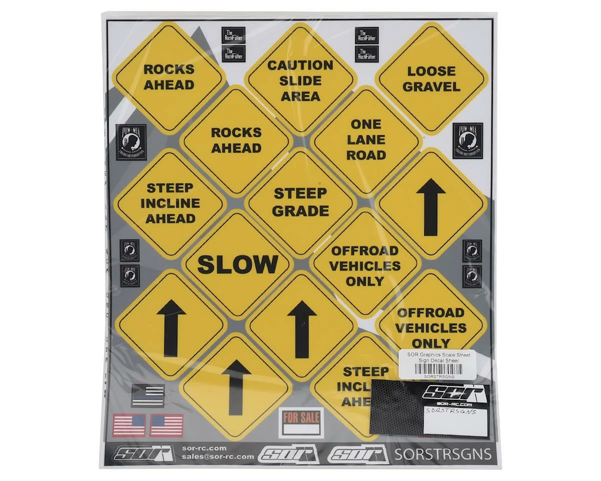The SOR Graphics Scale Street Sign Decal Sheet was developed to provide an alternative to boring tennis ball gates. These decals can be attached to styrene or lexan sheet to create unique signs that will stand out at your next club get together – or in your back yard course. Each sheet includes decals that will allow you to replicate a variety of street signs, including – rocks ahead, caution slide area, loose gravel, steep incline ahead, offroad vehicles only, directional arrows and more. Plus, a mix of POW*MIA, American flag, for sale signs and blue line American flag stickers have been included to fill up wasted space on the sheet. Package includes two full decal sheets.