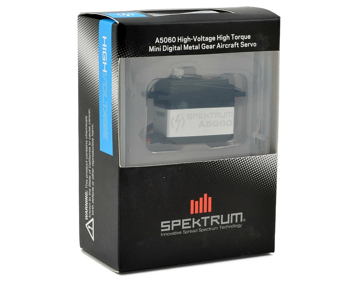 This is the Spektrum A5060 High Voltage Metal Gear Mini Digital Aircraft Servo. The A5060 delivers big servo performance in a small package. Perfectly sized for 25-32 size aircraft, the A5060 helps to keep the weight down without sacrificing performance. Able to deliver 118 oz-in of torque and 0.11 transit speed at 7.4V, the A5060 will deliver the power, precision and durability you have come to expect from Spektrum servos.