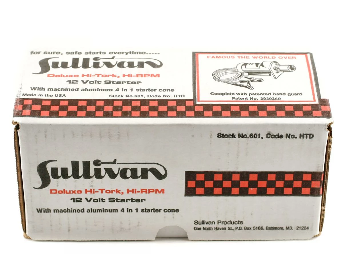 This is a Sullivan Deluxe Heavy-Duty, High-Torque 12V Starter. It is designed for starting Glow Engines up to .60 cubic inches in size. This starter features “Instant-On” Fingertip Control Switch and a full protection hand-guard for extra safety. This starter includes an aluminum V-Groove drive cone and comes with two alligator clips for easy attachment to a 12 volt battery.