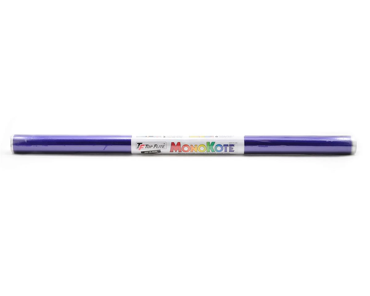 This is a Top Flite 6′ Roll of Metallic Plum MonoKote. MonoKote is a thin, clear, protective film with a pigmented, heat-activated adhesive on the back specially formulated for model airplanes. MonoKote is applied with a sealing iron. Heat from the iron shrinks the film while simultaneously activating the adhesive tightly bonding it to your model. When MonoKote is not heated, the adhesive is not sticky. The adhesive side has a clear, protective backing that must be removed before application.