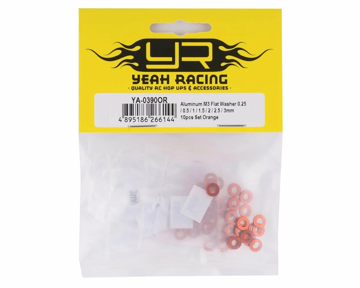 Yeah Racing 3×0.25/0.5/1.5/2/2.5/3mm Flat Washer Set. These optional washers are made from high quality aluminum and anodized orange for a clean look.