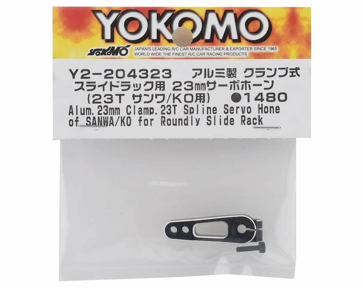 The optional Yokomo Aluminum Clamping Servo Horn for the Yokomo YD-2 is an aluminum servo horn that allows more direct operation of the servo. The distance from the servo output shaft to the center of the pillow ball attachment hole at the tip is 23mm, and matches the servo shaft spline (23T) made by Sanwa and Airtronics. It is the best size for touring cars. This part has been anodized black with chamfered edges for added strength and style.