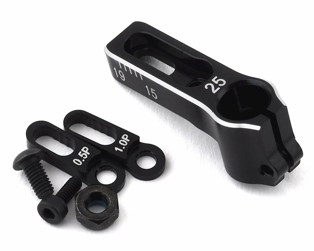 This is an optional Yokomo Team Suzuki Aluminum Adjustable SP Servo Horn, intended for use with Futaba, ProTek and other servos with 25 Tooth Splines. This is a high precision aluminum servo horn made by Team Suzuki that can be adjusted from 15mm to 19mm from the servo shaft center to the servo rod mounting pivot position. By changing the positioning frame, it can be set in 0.5mm increments. Two types of positioning frames, 0mm position standard and 0.5mm position standard, are attached, and mounting holes are set for each 1mm. These adjustments are finer and more accurate than the conventional servo horn, allowing for more detailed and specific adjustments of the steering and operation feel.